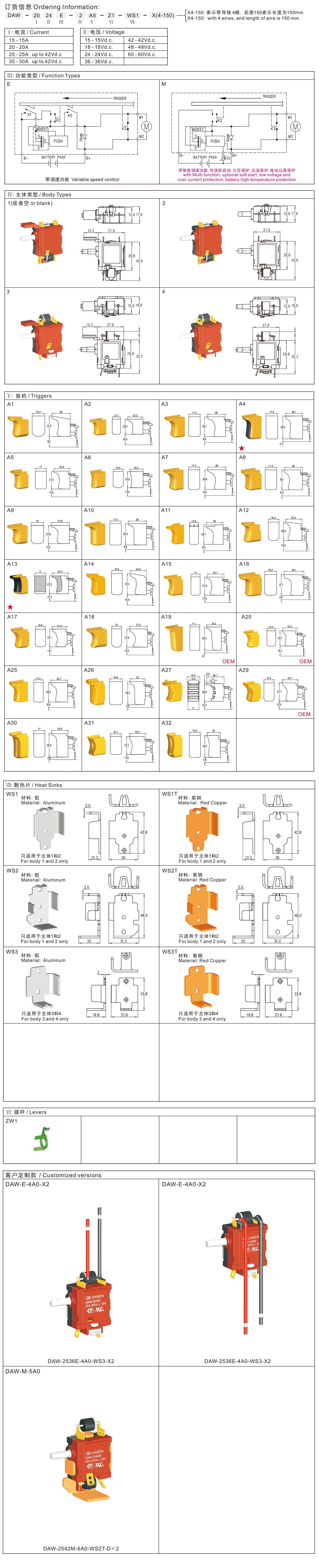 DAW series are one general type DC variable speed trigger switches, integrated dustproof and mechanical brake contact,without reversing box, commonly for used in DC portable power-tools and gardening tools such as: Cordless Rotary Hammers,Cordless Reciprocating Saws, Cordless Jig Saws, Cordless Angle Grinders, Cordless Grass Trimmers, Cordless Blowers, etc.