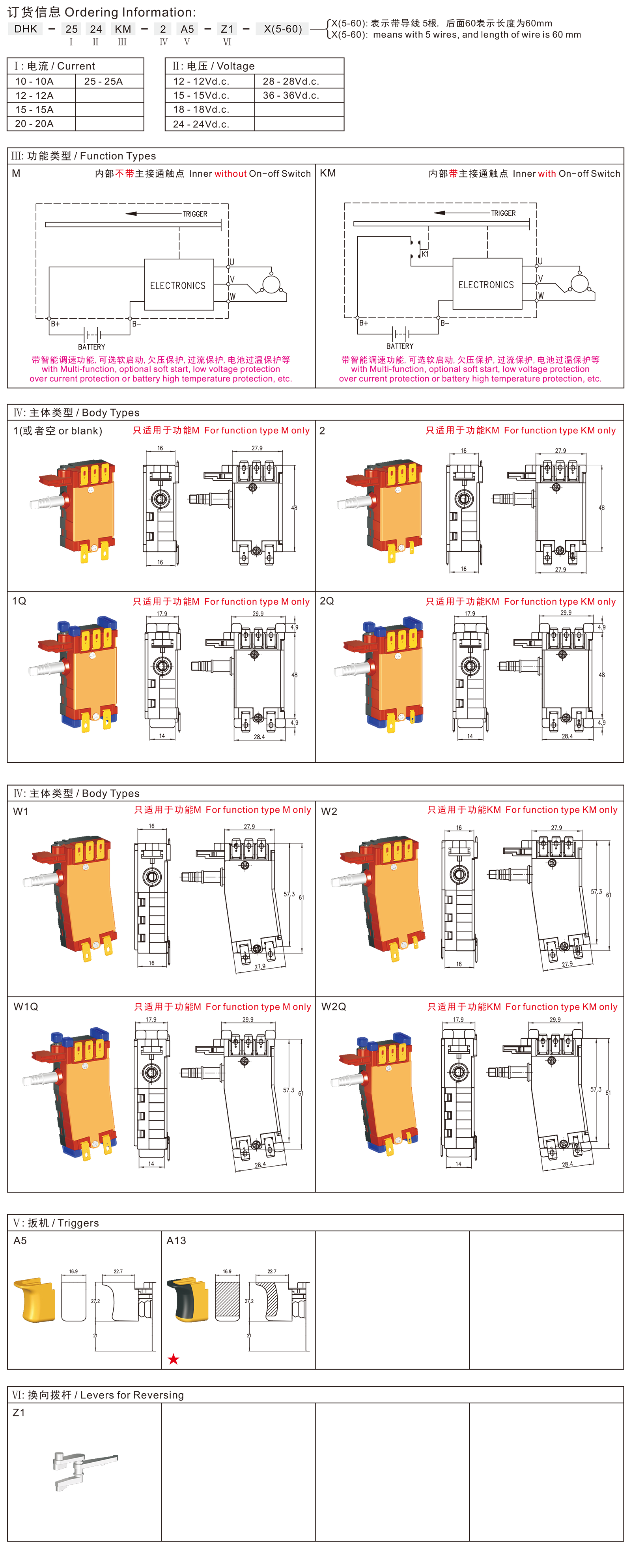 DHK系列是一款专用型的特别为无刷直流工具设计的直流扳机集成开关,带防尘功能集成各类功能,可选带主触点不带触点两个版本,应用于各类无刷手持电动工具,如:无刷充电式电钻、无刷充电式螺丝起子、无刷充电式冲击扳手、无刷充电式电锤等。