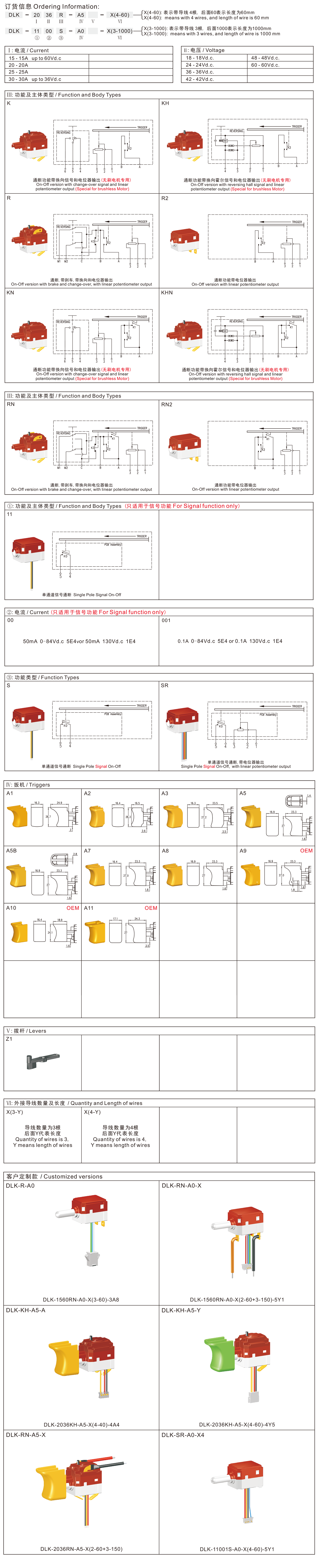 DLK series are one special type DC trigger switches, integrated dustproof and mechanical brake contact, optional with inner reversing structure, commonly for used in DC cordless portable power-tools and power gardening tools such as: Cordless Drills, Cordless Screw Drivers, Cordless Rotary Hammers, Cordless Impact Wrenches, Cordless Grass Trimmers, Cordless Blowers, etc. Besides, they also suitable for brushless DC tools.