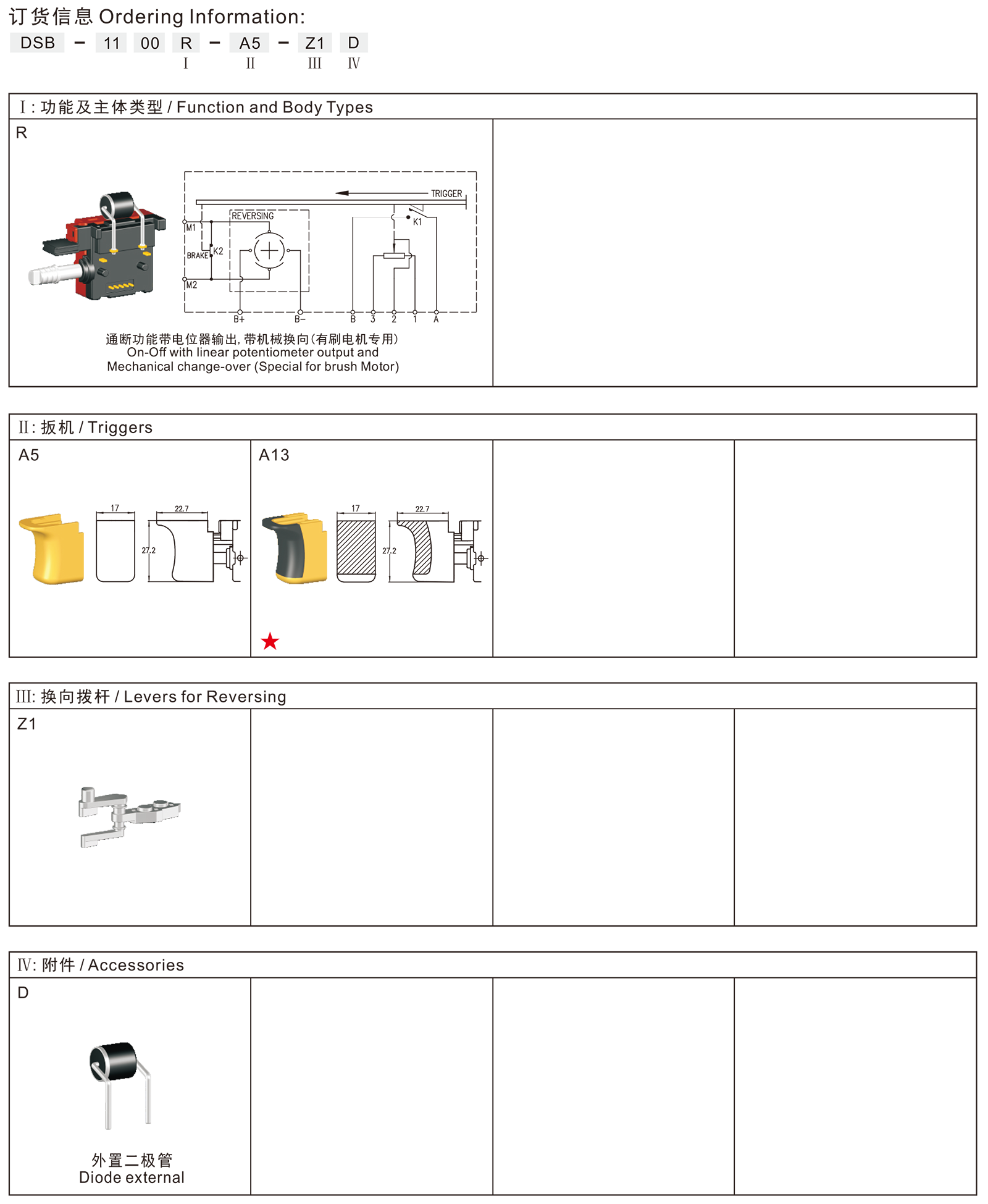 ◆DSB系列是一款专用型的直流信号扳机开关,集成防尘功能和机械刹车接点,适用于各类直流充电式电动工具,如:充电式电钻、充电式电锤、充电式螺丝起子、充电式冲击扳手等。特殊设计的外形可以和线路板直接连接,而不需要外接导线。