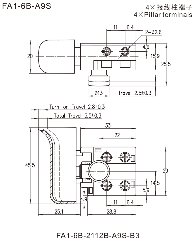 →2×接线柱端子 Pillar terminals φ=2.6mm or 2.8mm