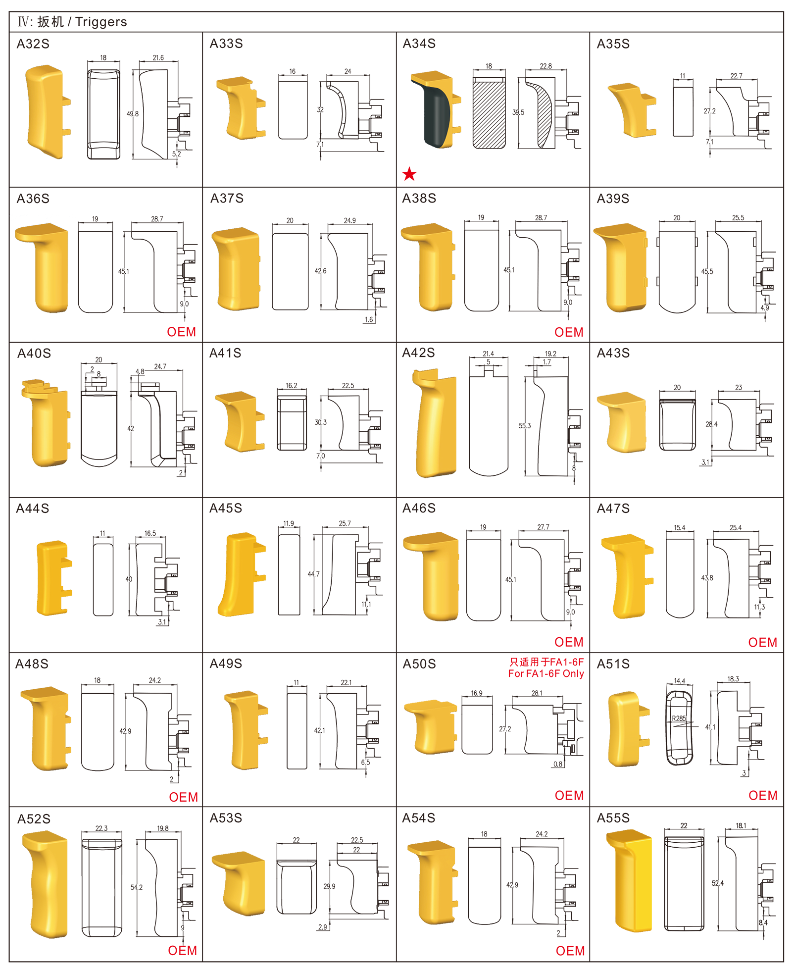 ◆FA1-6B系列是一款通用型的扳机开关,集成防尘功能,广泛应用于各类手持式电动工具,如:电钻、电锤、往复锯、曲线锯、搅拌器、型材切割机、石材切割机、电圆锯、电木铣、砂带机、砂光机、电刨、电动喷枪、电动钉枪,也可应用于电动园林工具,如:打草机、电链锯、电动割草机、电动扫雪机等。