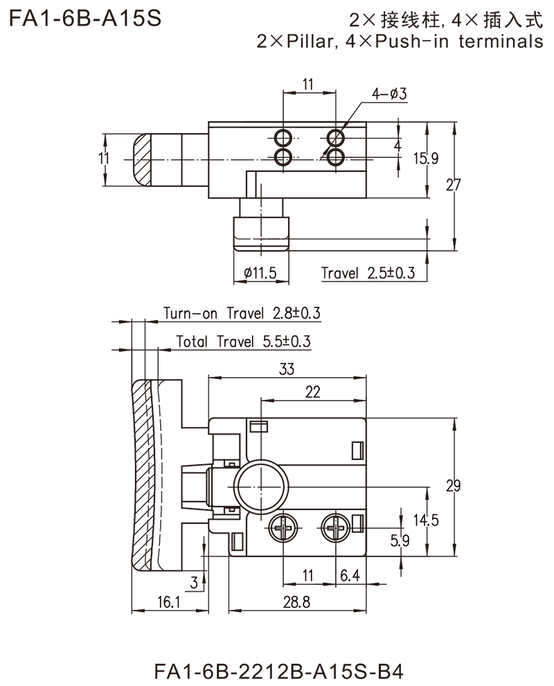 FA1-6B系列是一款通用型的扳机开关,集成防尘功能,广泛应用于各类手持式电动工具,如:电钻、电锤、往复锯、曲线锯、搅拌器、型材切割机、石材切割机、电圆锯、电木铣、砂带机、砂光机、电刨、电动喷枪、电动钉枪,也可应用于电动园林工具,如:打草机、电链锯、电动割草机、电动扫雪机等。