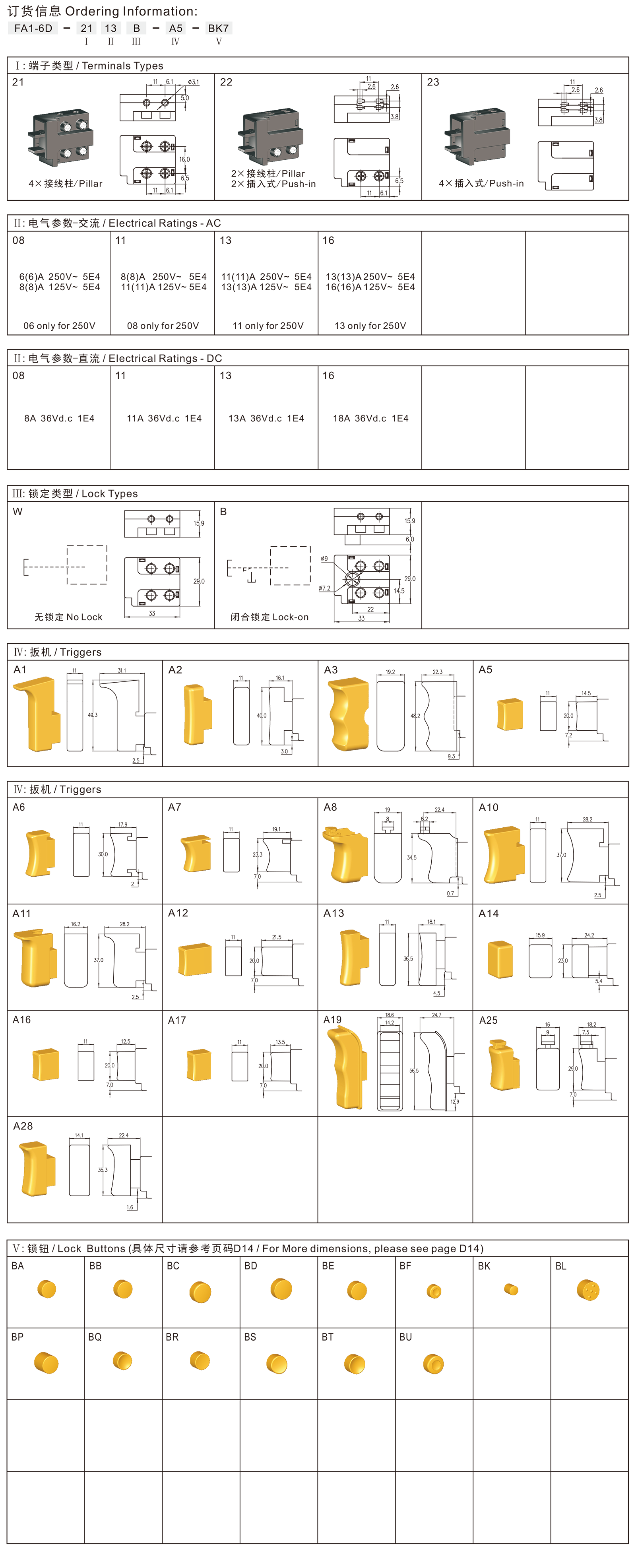 ◆FA1-6D series are one general type trigger switch, with with snap-action structure, for used in portable power-tools and gardening tools such as Electric Mixers, Electric Nailers, Grass Trimmers, Electric Chain Saws, Electric Lawnmowers, Electric Snowthrowers, etc.