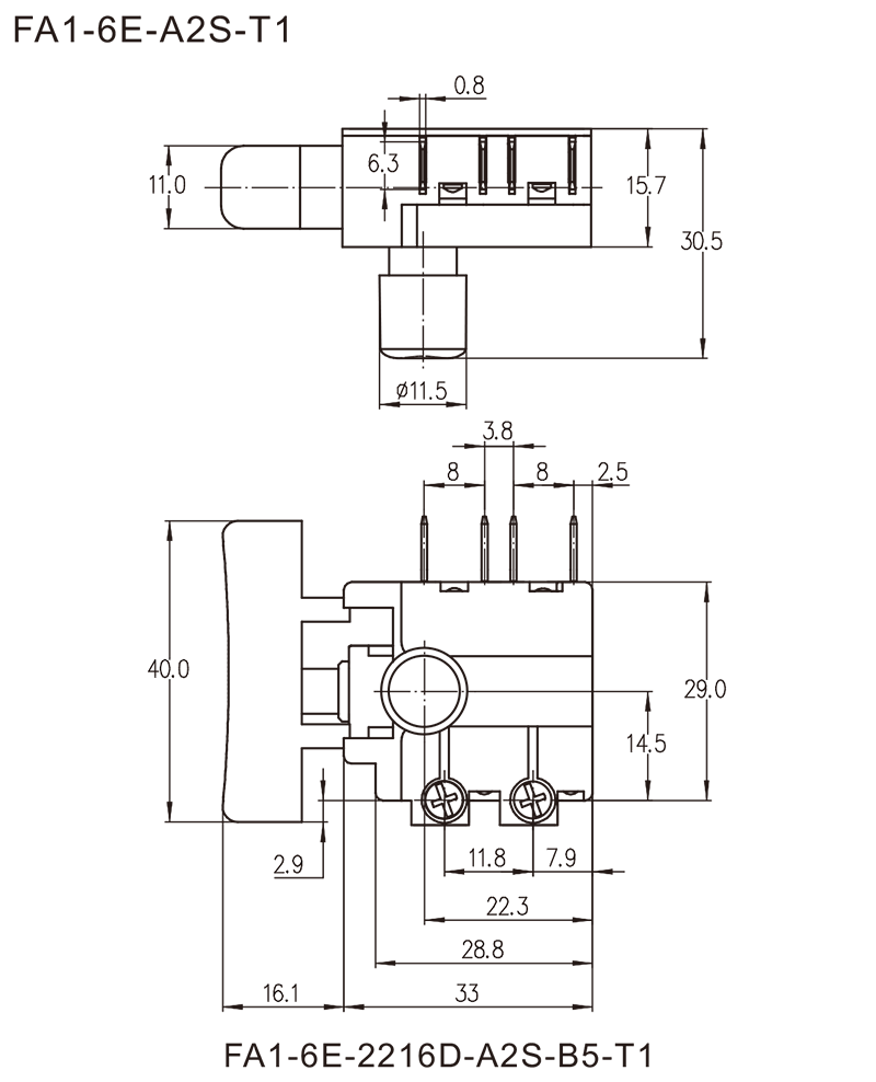 FA1-6E series are general type trigger switches, integrated dustproofwith snap-action structure, commonly for used in portable power tools such as Electric Drills, Rotary Hammers, Reciprocating Saws, Jig Saws, Angle Grinders, Electric Mixers,Cut-Off Machines, Marble Cutters, Electric Routers, Circular Saws, Belt Sanders, Orbit Sanders, Polishers, Electric Planers, Electric Sprayers, Electric Nailers, etc. Besides, they are also suitable for power gardening tools, such as Grass Trimmers, Electric Chain Saws, Electric L awnmowers, Electric Snowthrowers, etc.