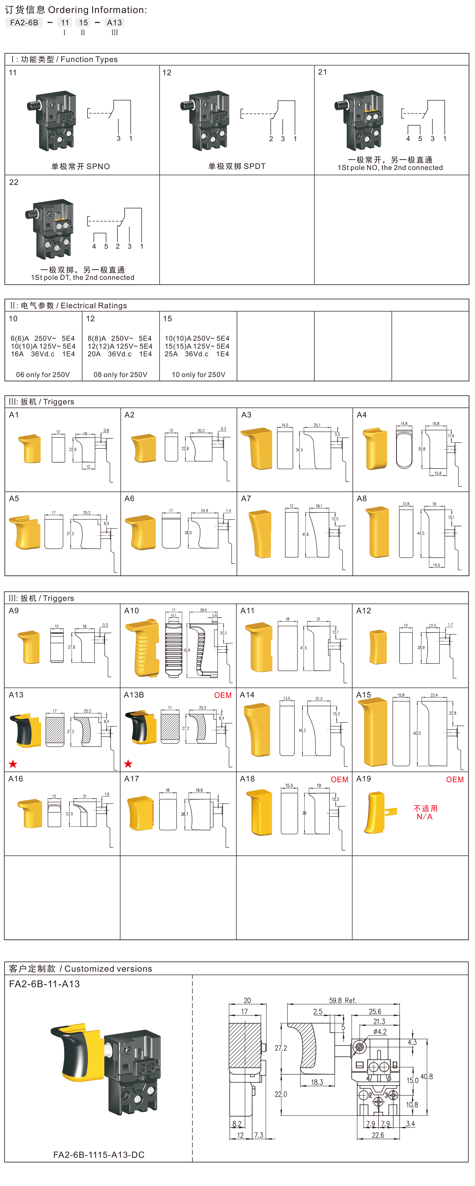 FA2-6B系列是一款通用型的扳机开关,集成防尘功能,广泛应用于各类电动工具,如:型材切割机、斜切锯、电圆锯、电锤等。