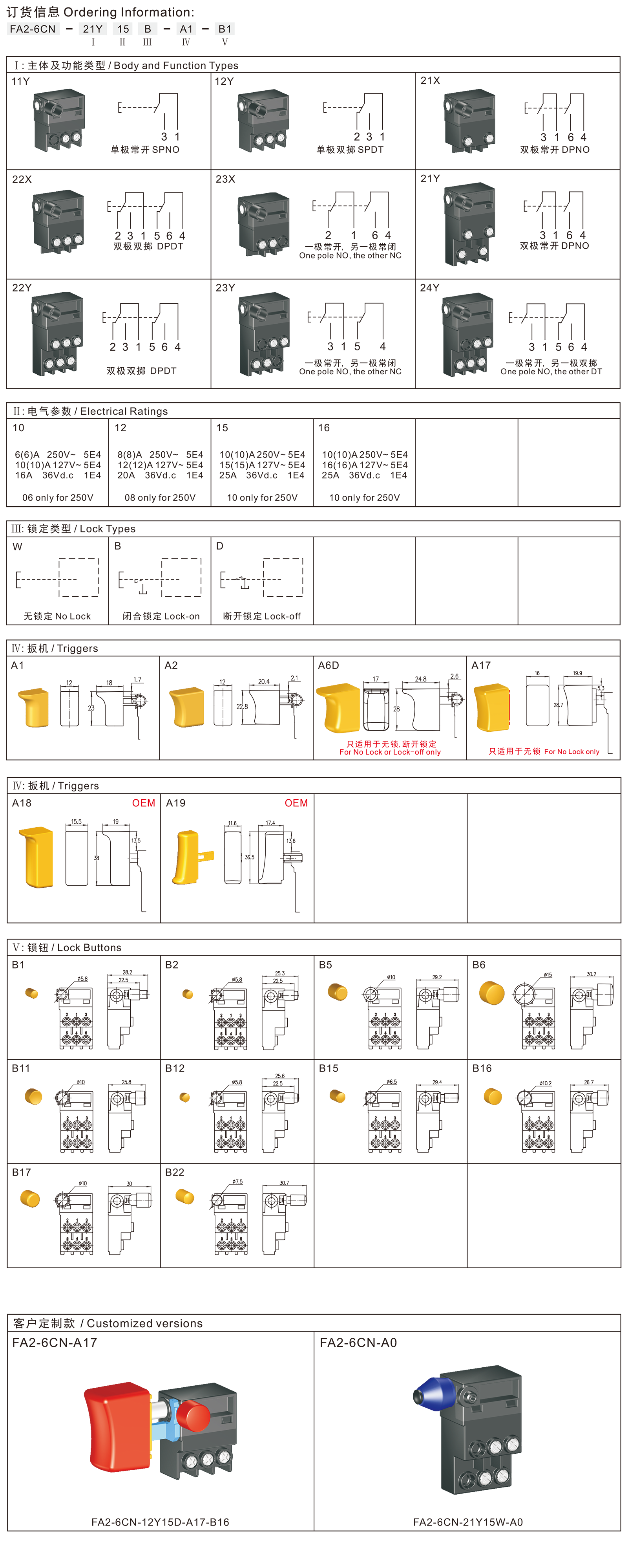 FA2-6CN系列是一款通用型的扳机开关,为FA2-6C系列的防尘改进款广泛应用于各类电动工具,如:型材切割机、斜切锯、云石机、电圆锯、电锤、电木铣、砂带机、砂光机、电刨等。