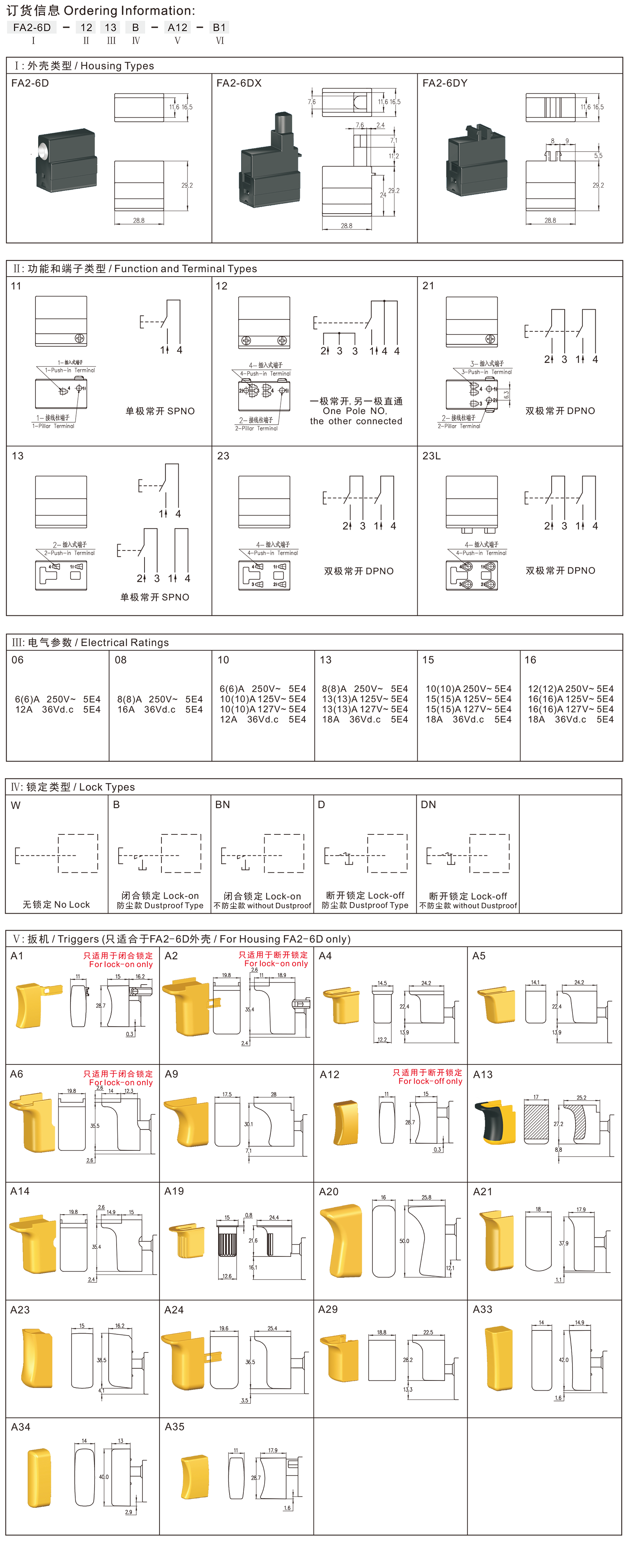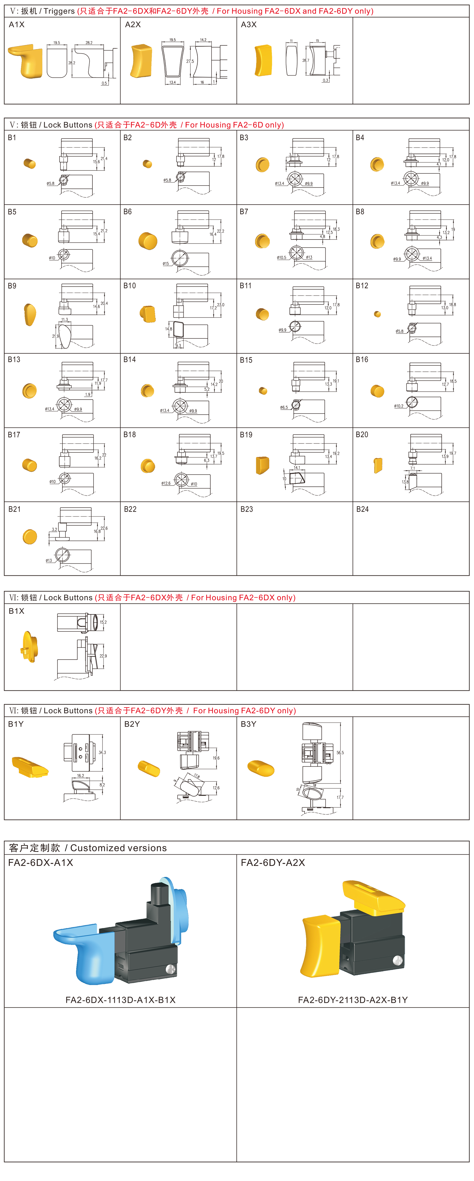 ◆FA2-6D, DX, DY series are one general type trigger switch, optional integrated dustproof version, commonly for used in power tools such as Marble Cutters, Circular Saws, Electric Hammers, Electric Routers, Belt Sanders, Belt Saws, Electric Planers, Electric Mixers, Electric Sprayers, etc.