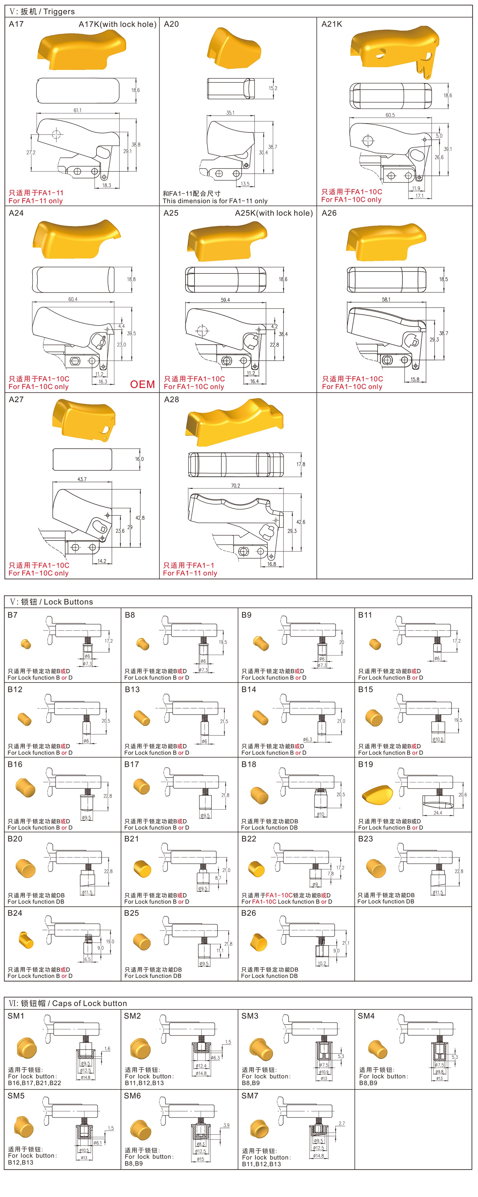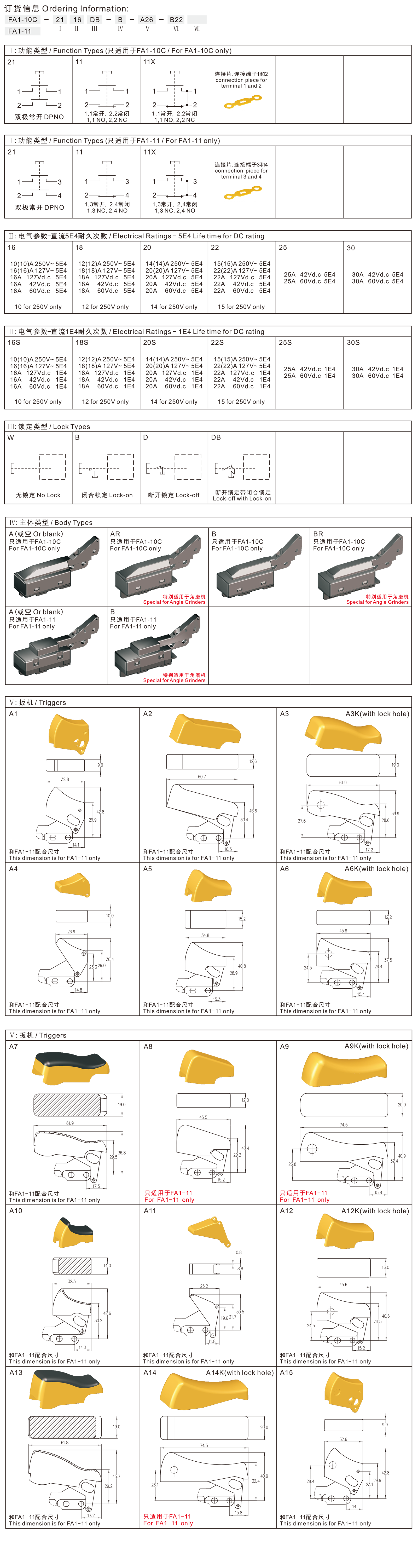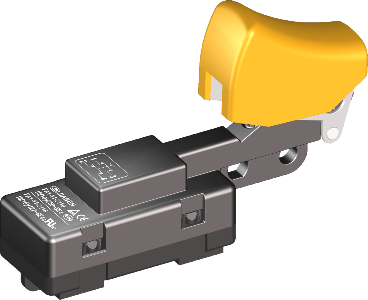 FA1-10C, FA1-11 series are general type high rated trigger switches, integrated dustproofwith snap-action structure, for used in high rated bench-top, portable power-tools and gardening tools such as Cut-off Machines, Miter Saws, 150mm, 180mm and 230mm Large Angle Grinders, Polishers, Circular Saws, Rotary Hammers, Demolition Hammers, Electric Chain Saws, etc.