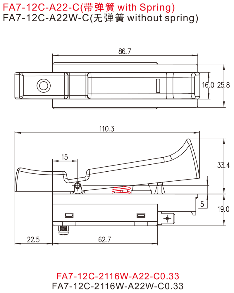 FA7-12C系列是一款专用型的大电流扳机开关,集成防尘功能,内部为快速动作结构,广泛应用于各类的电动工具,如:型材切割机,斜切锯(介铝机), 125和150中角磨,电锤,电镐等.有超过10种主体和扳机可供选择,也可按照客户要求定制.