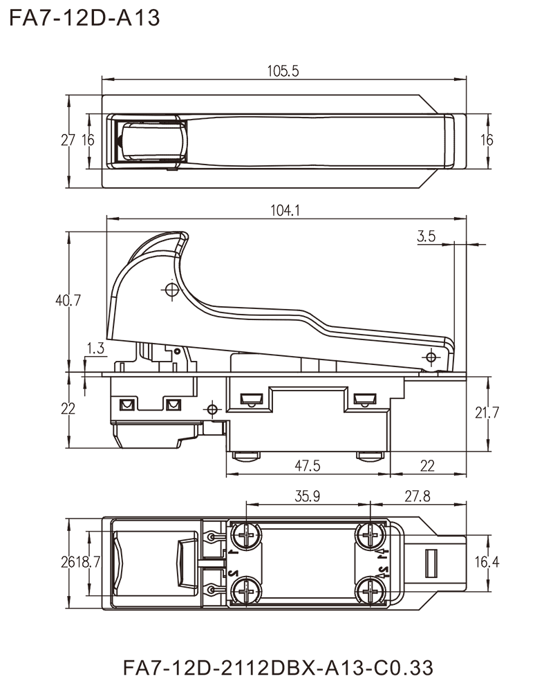 FA7-12D series are one special type AC trigger switches,integrated dustproof, with snap-action inner structure and restart protection when the power supply is interrupted (MechanicalType),designed specially for small angle grinders according to EN60947, for used in portable and bench top power-tools such as Cut-off Machines, Miter Saws, 1 50mm, 180mm and 230mm L arge Angle Grinders, etc.