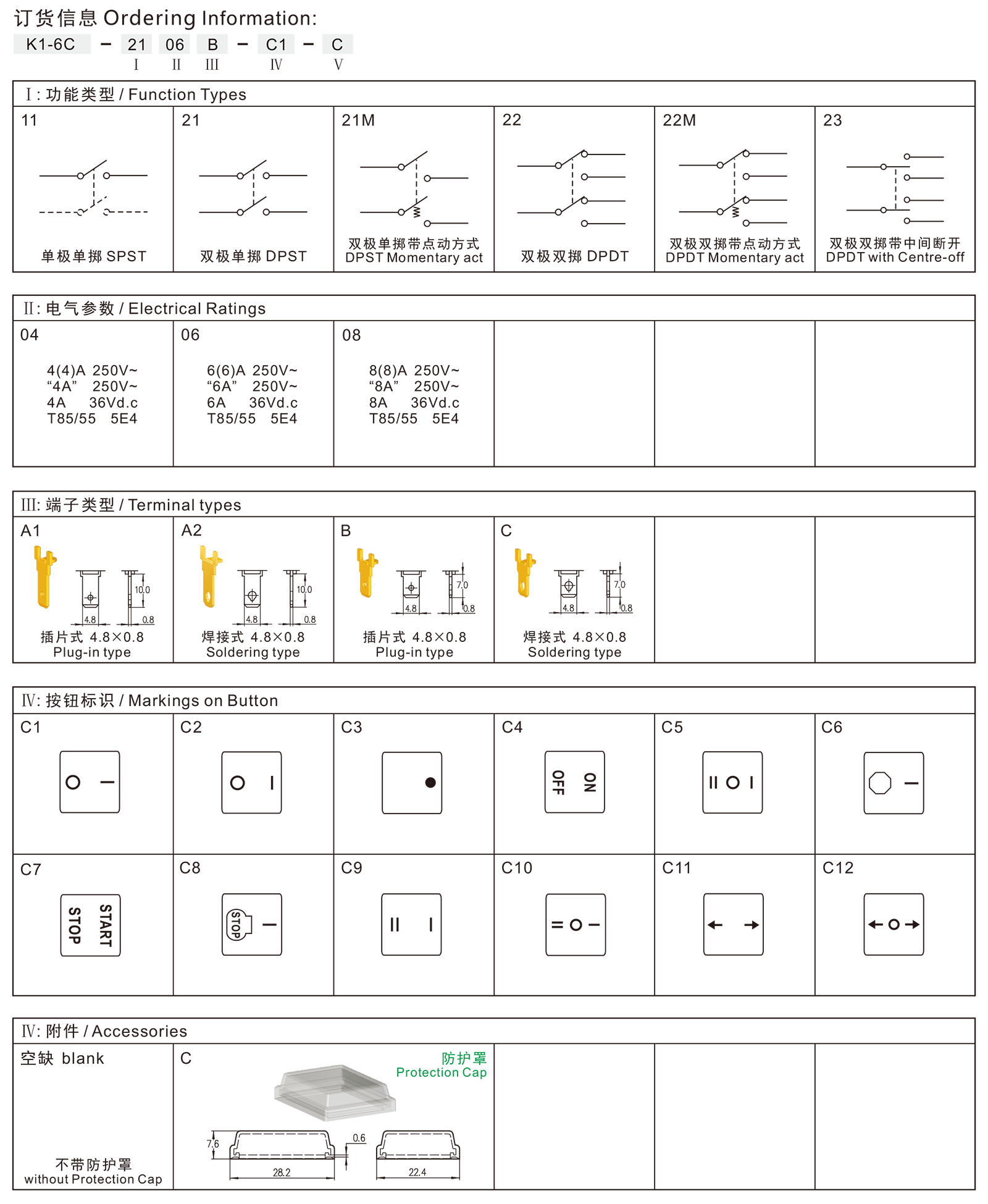 K1-6C series are one standard type rocker switch, optional with Protection Cap for dustproof and waterproof, commonly for use in small Home appliances and office equipments, such as Reading Lamps Electric Fans, Printers, Game Players, Computer P ower-supplys, Power Sound Box, etc.