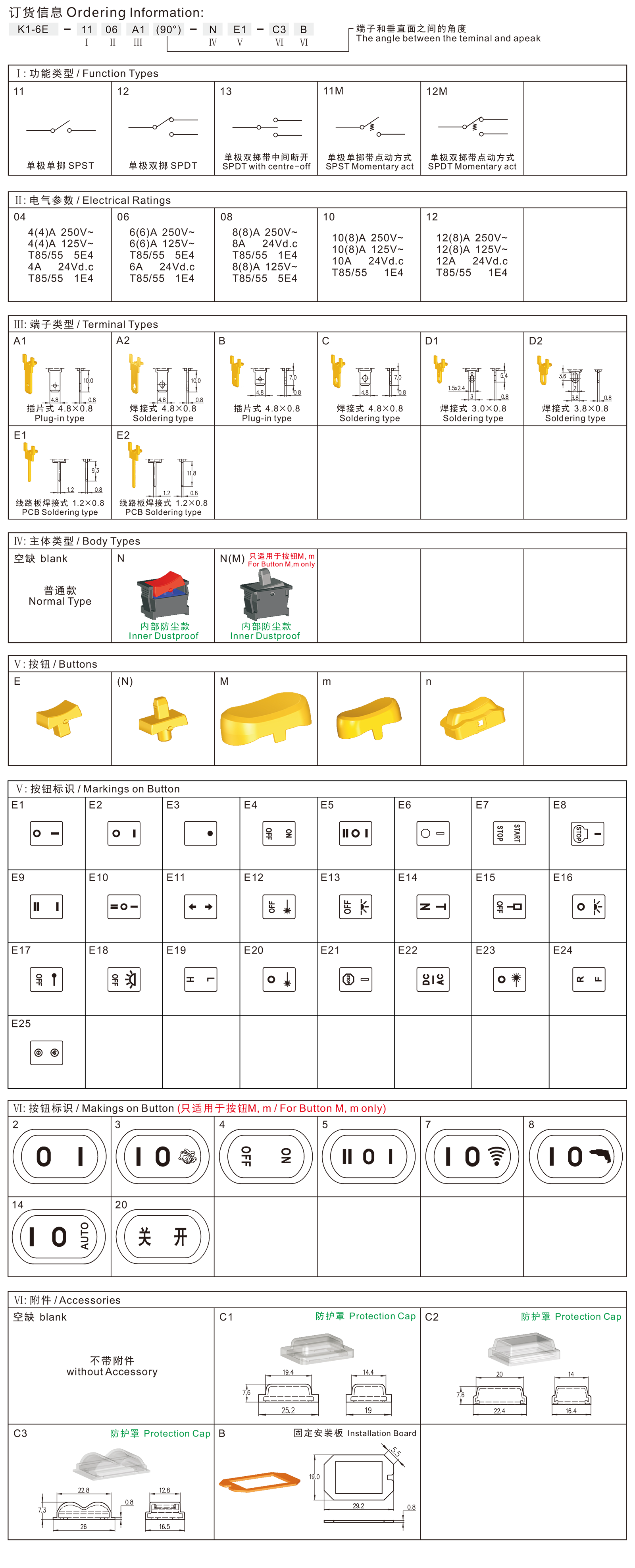 K1-6E series are one standard type rocker switch, optional with Protection Cap for dustproof and waterproof, or with inner dustproof structure, commonly for use in portable power-tools such as Hand Sanders, Die Grinders, Electric Nailers, Laser Actuators, etc. Also for used in small Home appliances and office equipments, such as Reading Lamps, Electric Fans, Printers, Game Players, Computer Power-supplys, Power Sound Box, etc.