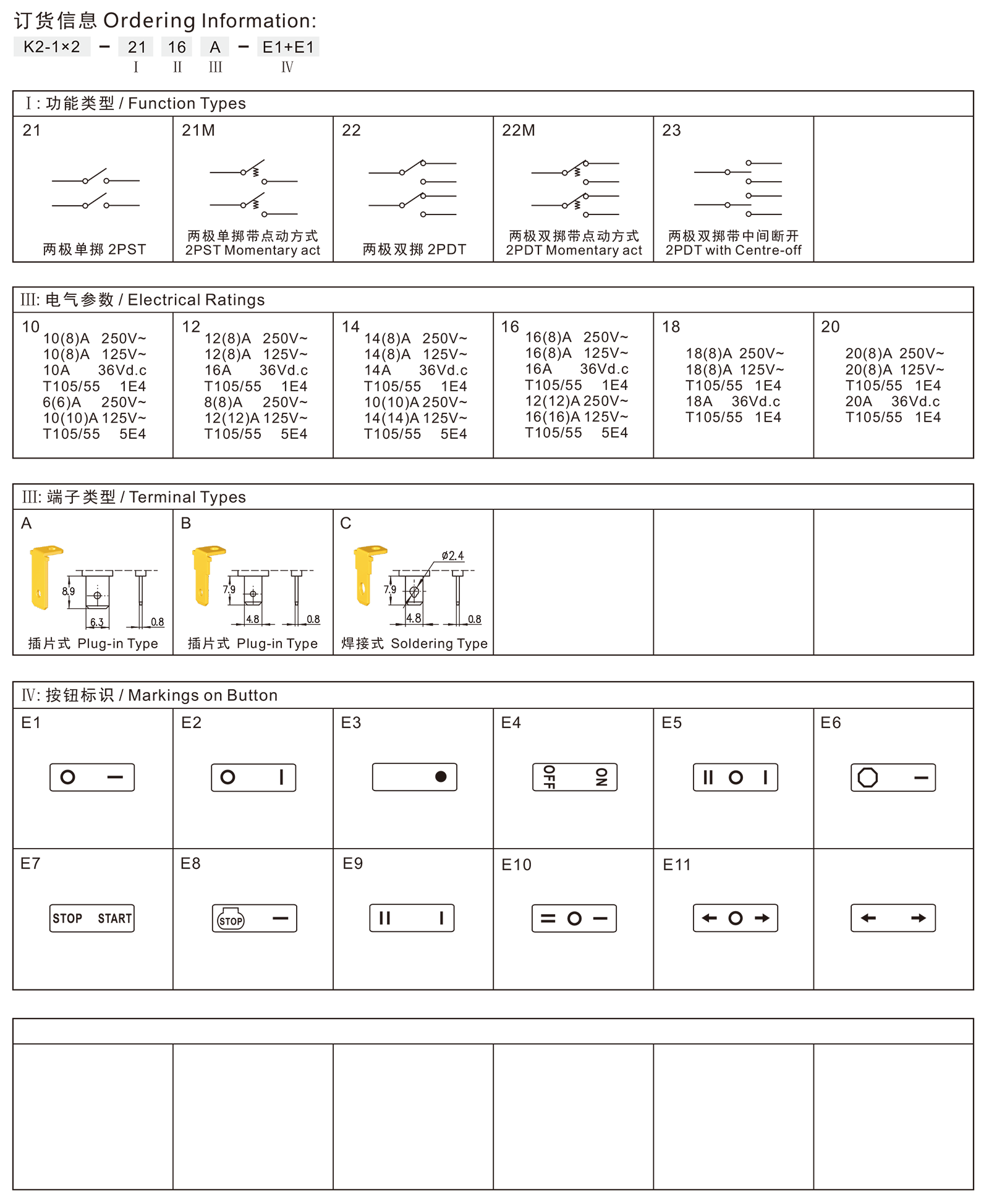 K2-1x2系列是一款标准型的跷板开关,也通称船型开关、波形开关等,用途极广,广泛应用于各类家用电器及办公设备,如:电扇、饮水机、取暖器等。