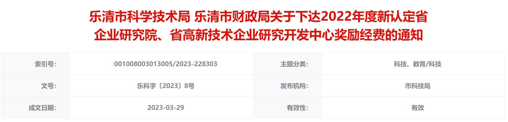 为了推动我市科技进步,加快区域科技创新体系建设,根据《乐清市人民政府关于印发<乐清市进一步推动工业经济高质量转型发展若干政策>的通知》(乐政发〔2022〕6号)、《关于印发<乐清市科技项目资金管理办法>的通知》(乐科字〔2022〕32号)和《浙江省科学技术厅关于公布2022年度新认定省级企业研发机构名单的通知》……